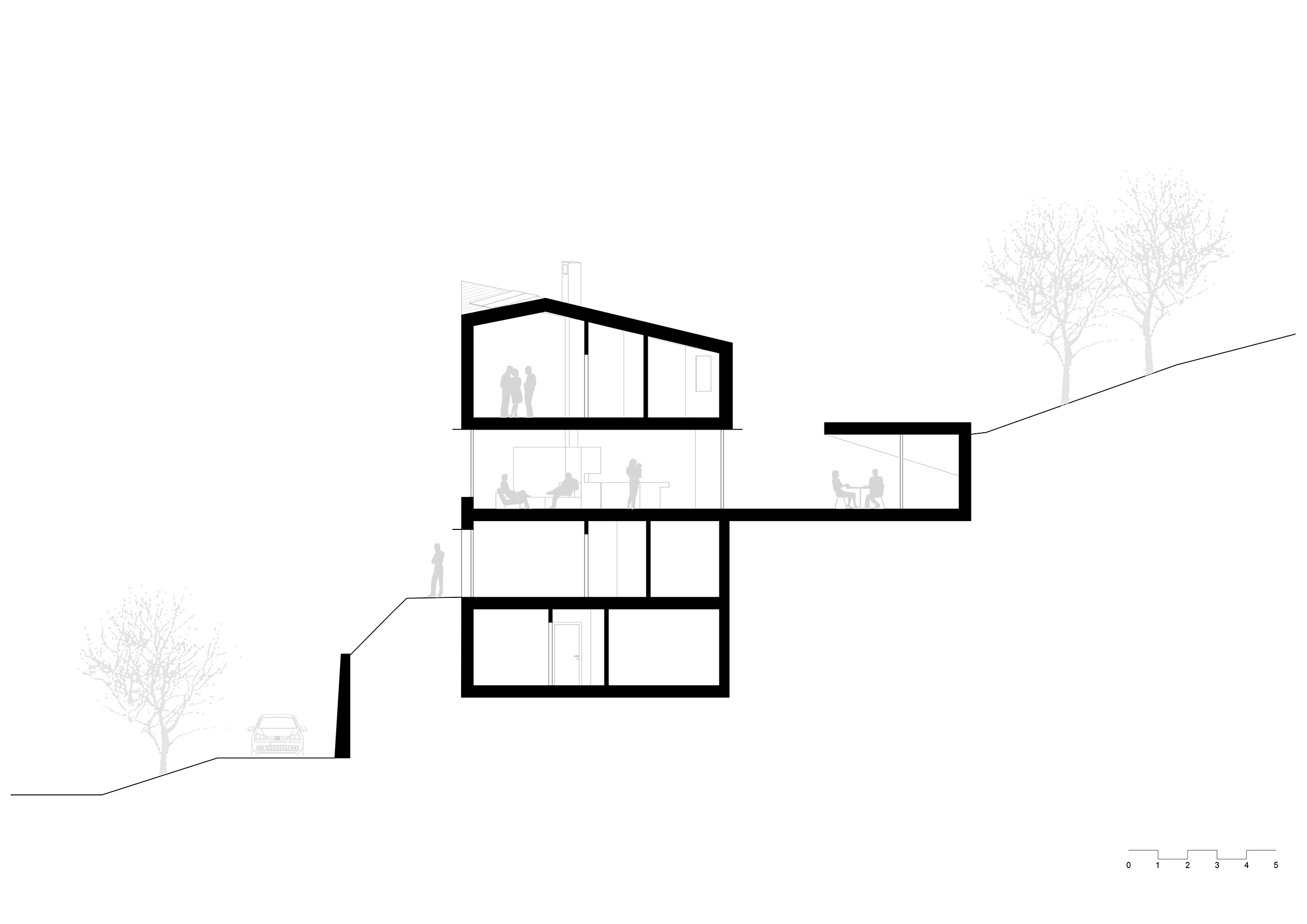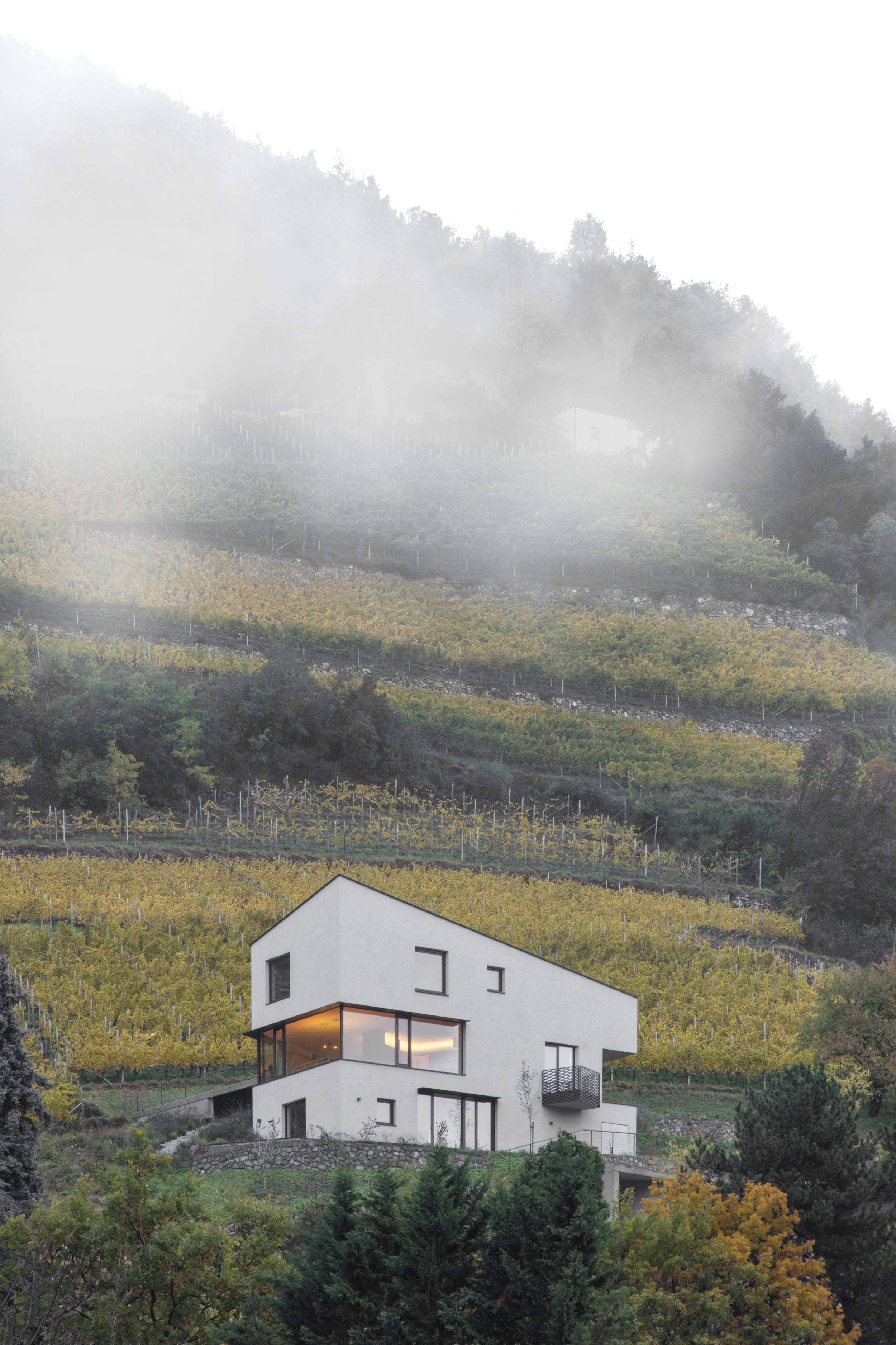 Inmitten der Weinberge oberhalb der Künstlerstadt Klausen situiert sich der Neubau mit großzügigen Verglasungen und einem privilegierten Blick auf das Kloster Säben und das Eisacktal. Das Haus, sein Anbau auf der Bergseite und die Außenbereiche stehen in direktem Dialog mit der Topographie, dem Tal und den Bergen, in denen sie eingebettet sind.
