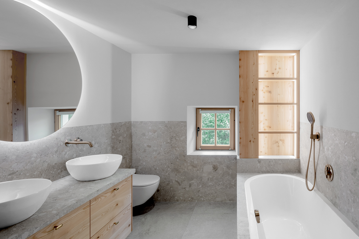Der denkmalgeschützte Kircherhof prägt seit Jahrhunderten das Dorfbild von Albeins. Mit viel Sorgfalt und Respekt vor seiner Geschichte wird er in ein Mehrgenerationenhaus verwandelt. Eine sanfte Sanierung sichert die wertvolle Bausubstanz, traditionelle Handwerkstechniken lassen den Hof in seiner ursprünglichen Schönheit neu erstrahlen. Im Erdgeschoss finden die Eltern ihren Platz, während die Jungfamilie in den oberen Stockwerken lebt. Der historische Dachstuhl wird in seiner ursprünglichen Form zurückgeführt, innen prägen schlichte Putzflächen und warme Holzoberflächen die Atmosphäre. So entstehen zwei hochwertige Wohnungen, in denen die Vergangenheit spürbar bleibt und zugleich Raum für die Zukunft wächst.