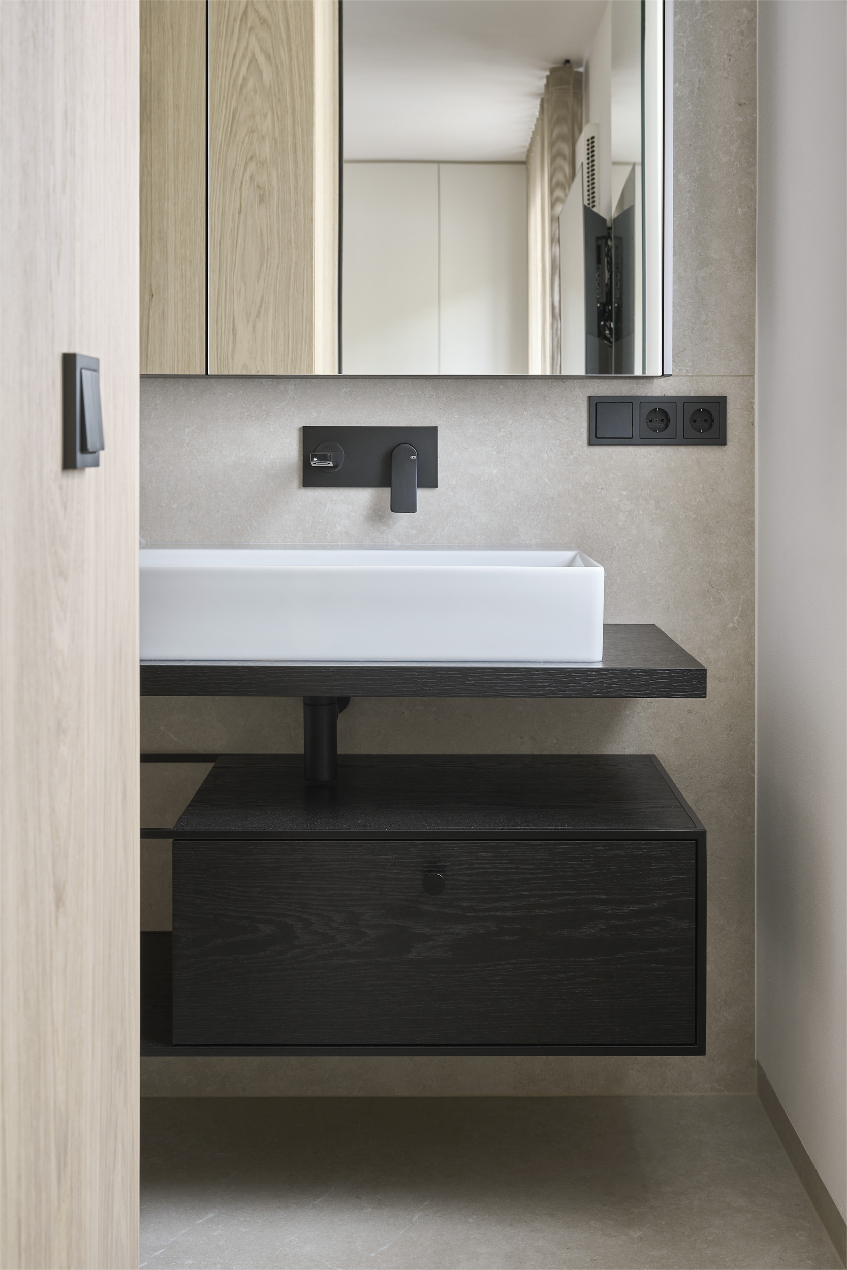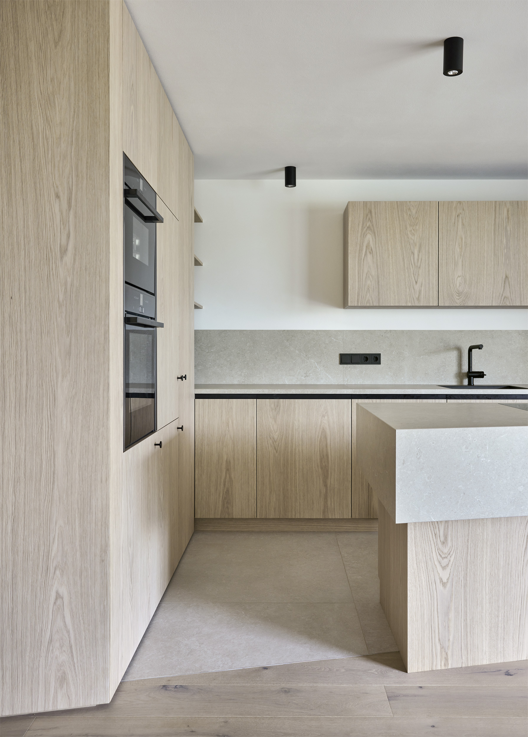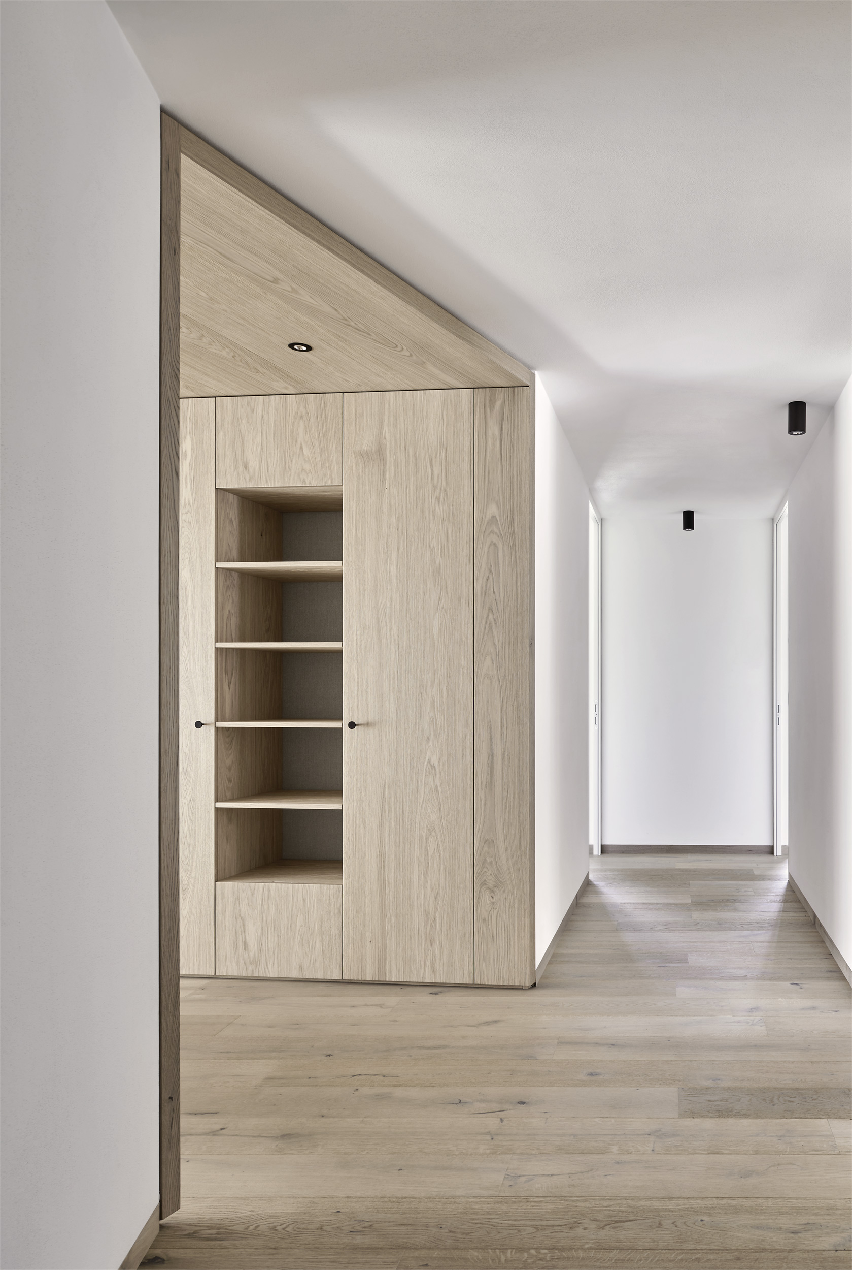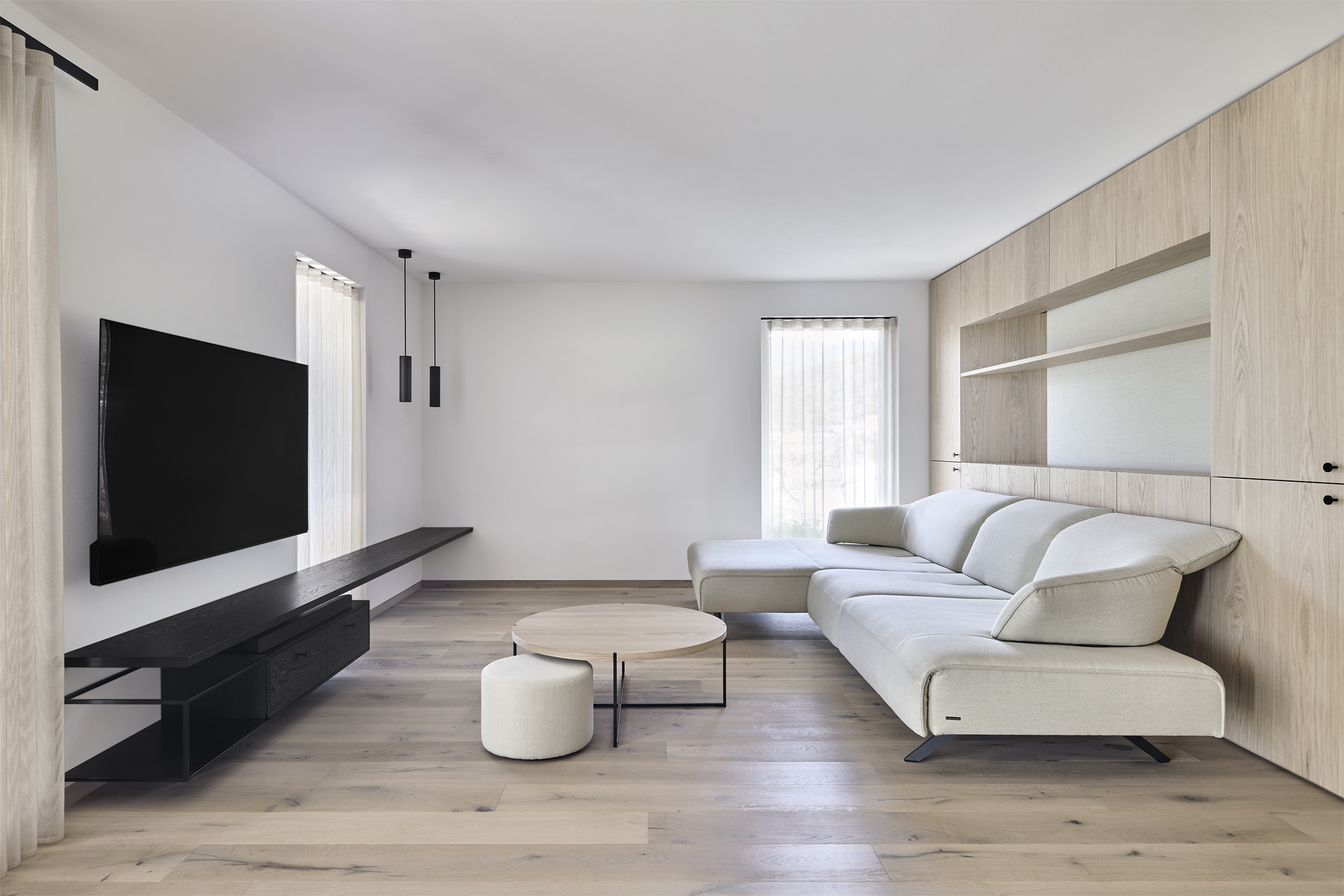 Kalkstein, Eiche, Textil. Wertige und zeitlose Materialien prägen unsere kürzlich fertiggestellte Wohnung in Schabs. Die lichtdurchflutete Wohnung überzeugt mit zeitloser Ästhetik und raffinierten Details. Während das weiß pigmentierte Eichenholz eine helle und warme Grundatmosphäre schafft, setzt die Kochinsel mit seiner Kalksteinoberfläche einen stilvollen Akzent.
