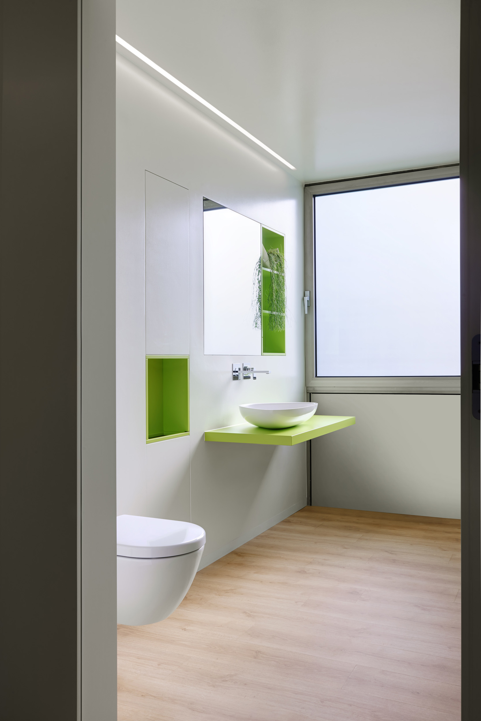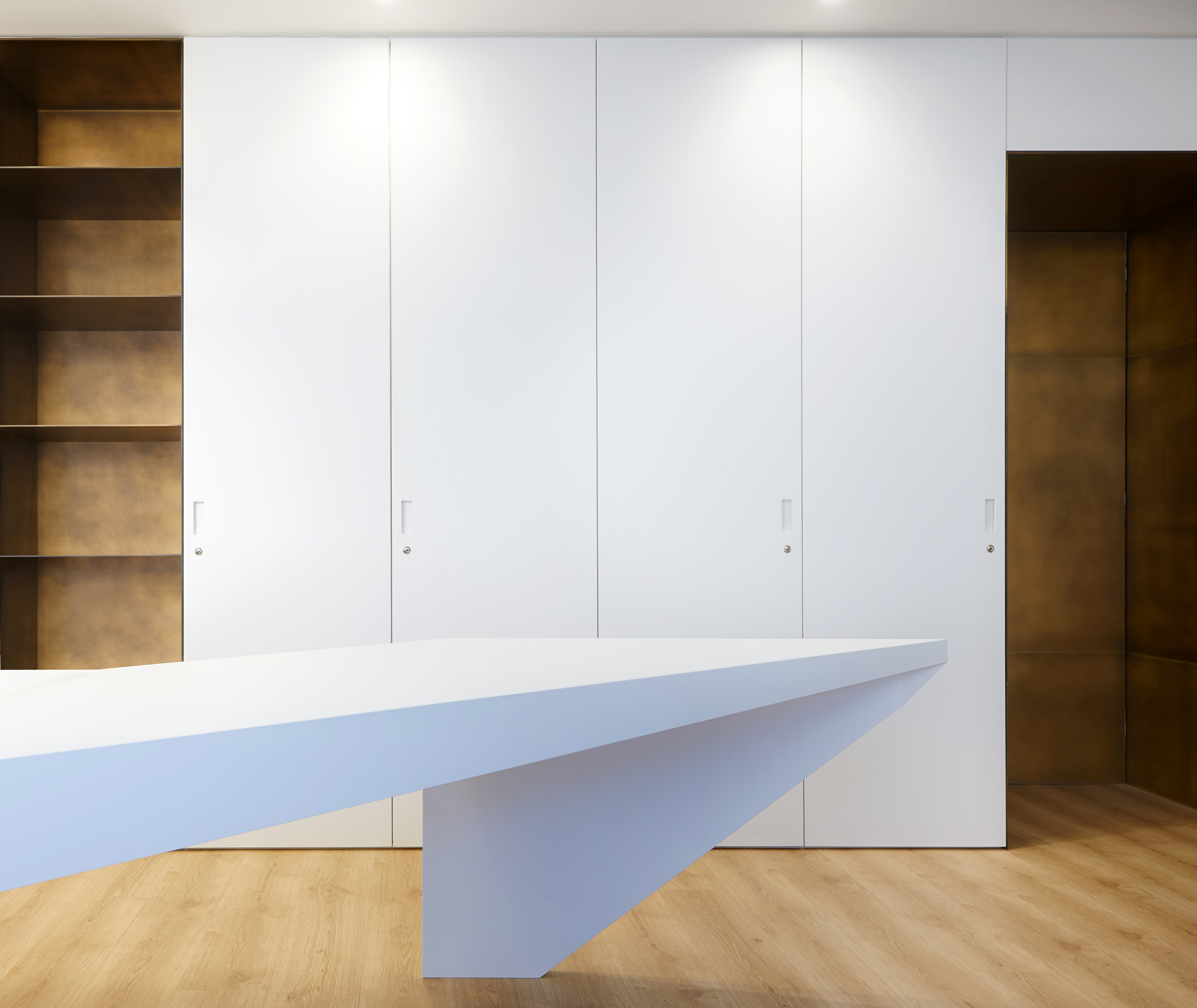 Die Möbel sind in schlichtem weiß gehalten und werden von den edlen Auf- und Anbauten, sowie Einschlüssen in Bronze in Farbe und Haptik kontrastiert. Als lebende Komponente sind Pflanzen von zentraler Bedeutung. Grün als Farbe der Mitte symbolisiert Neubeginn und Wachstum, Grün ist jene Farbe die den Zustand der Gesundheit am besten zu erreichen und erhalten hilft.