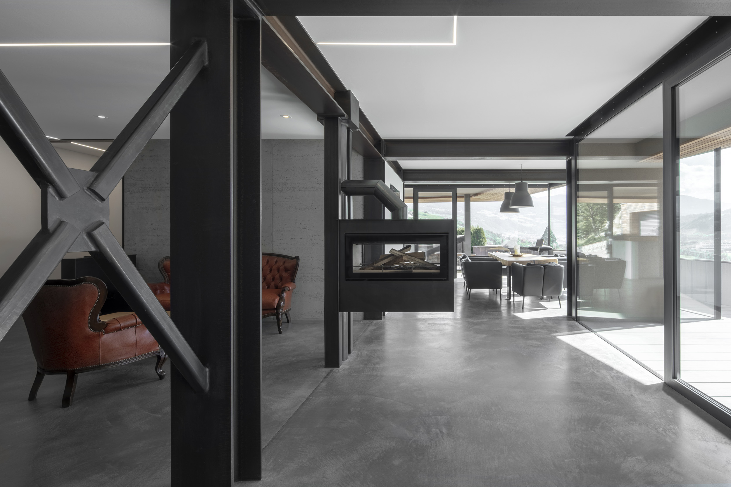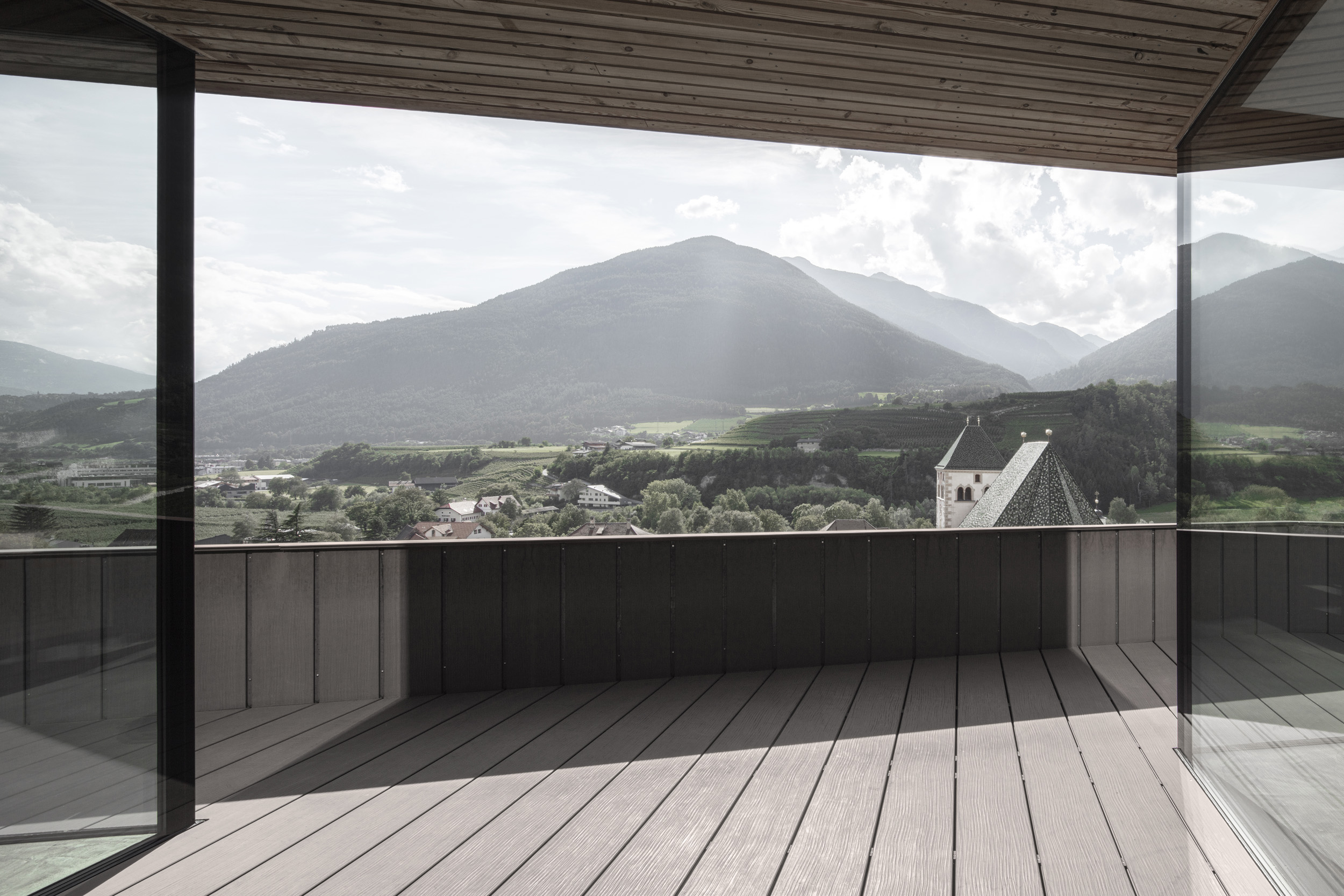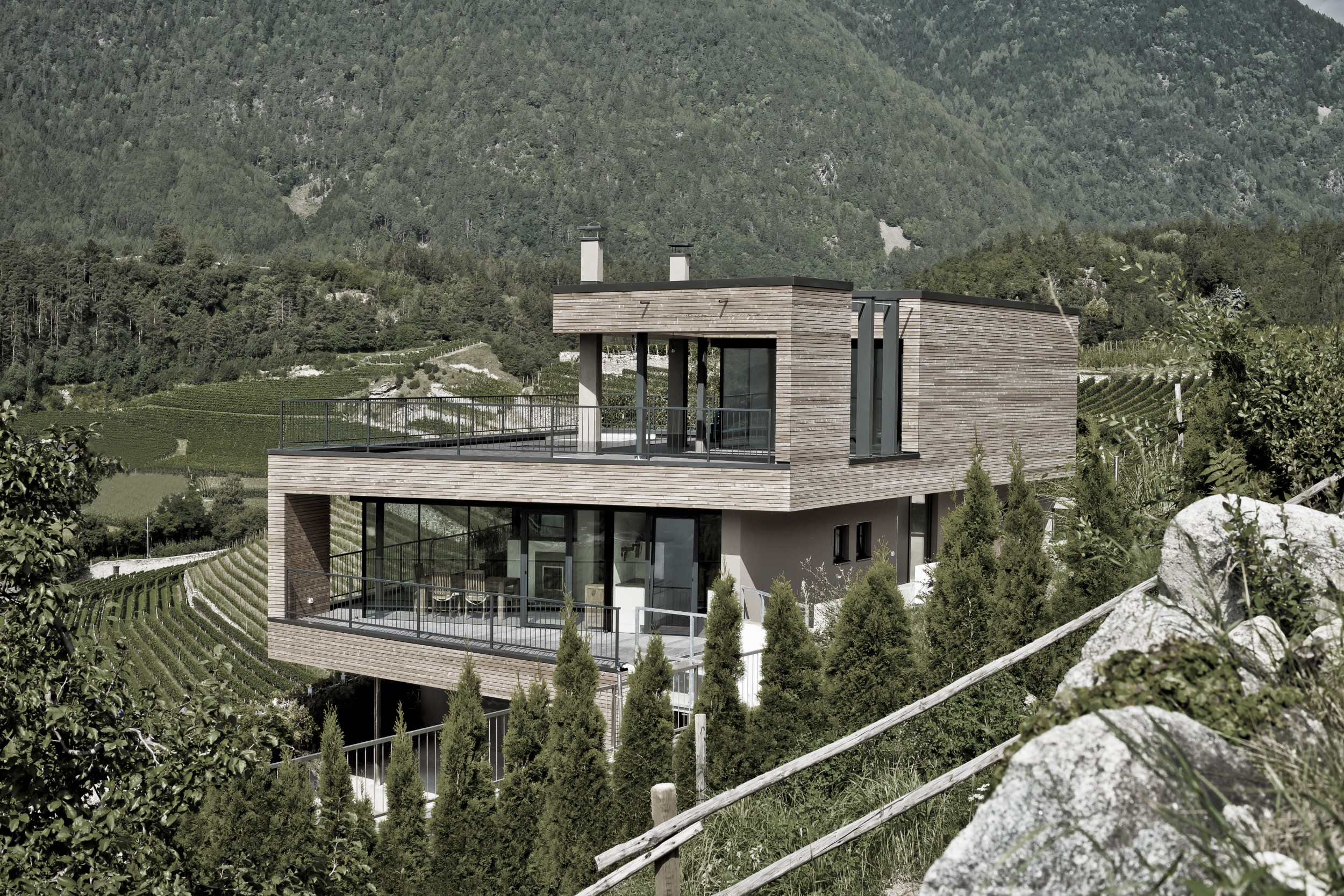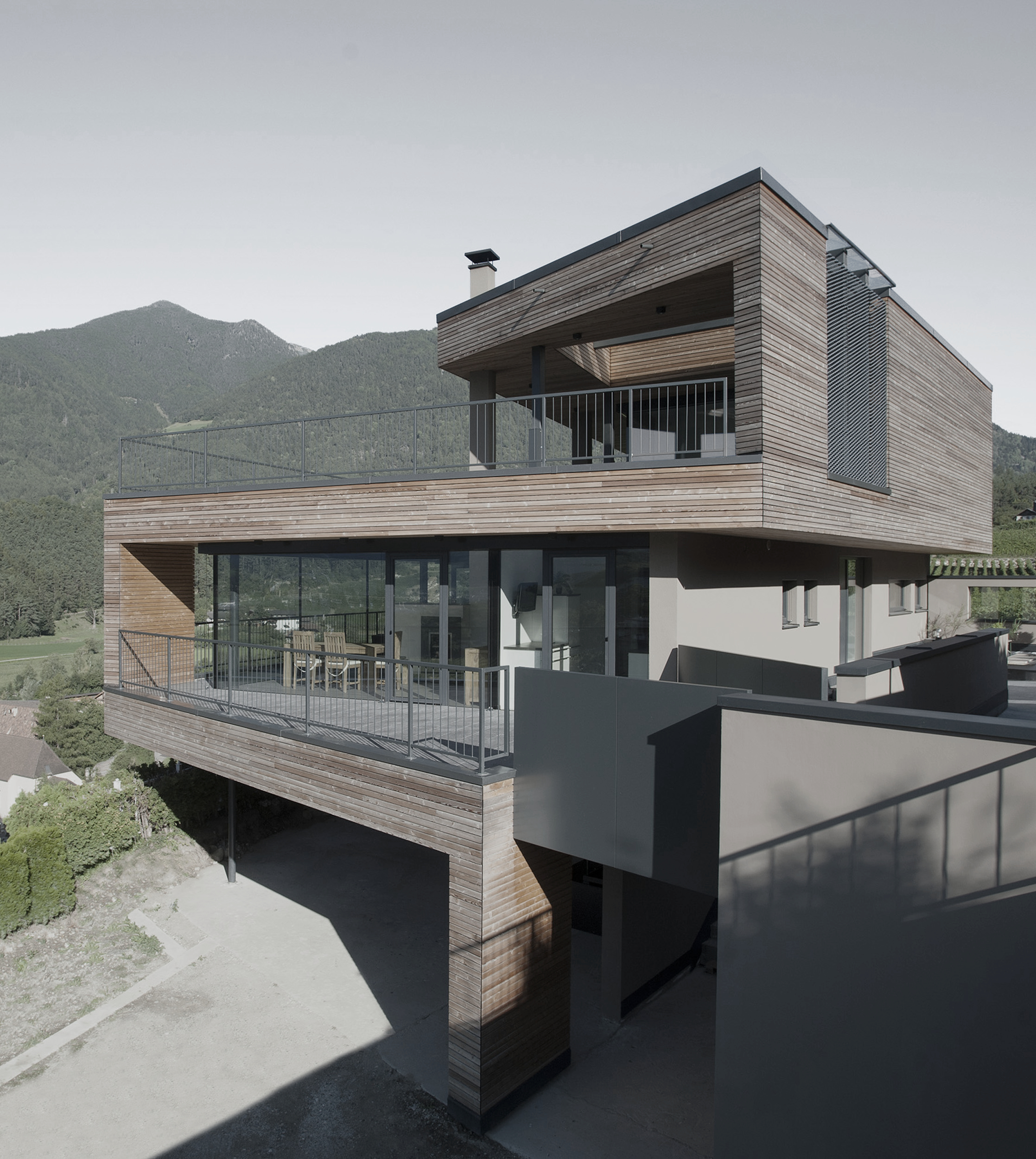 Un gioco tra spazio aperto e spazio abitativo caratterizza il piano terra. Le camere aperte e luminose offrono una vista mozzafiato sulla valle e sul panorama. I lavori di ristrutturazione effettuati, orientati alla riprogettazione del piano superiore e del sottotetto, hanno portato struttura, modernità e apertura al piano. Il risultato è stato un migliore utilizzo dello spazio e una maggiore qualità abitativa, ottenuta grazie alla riduzione delle pareti esterne, alle ampie vetrate e alla nuova struttura.
