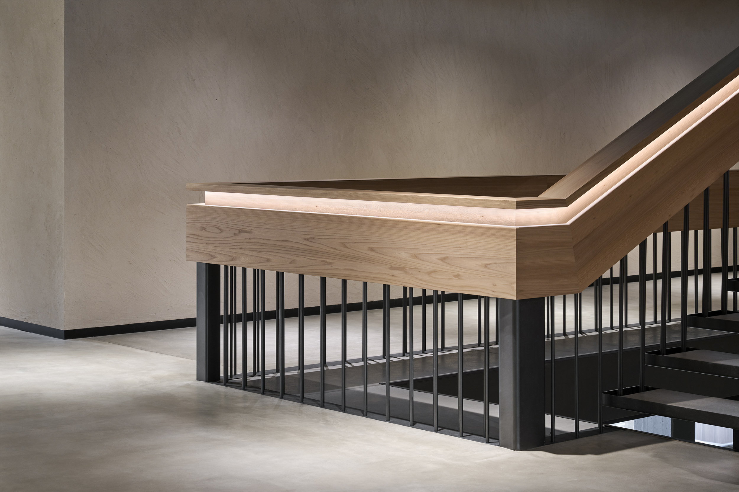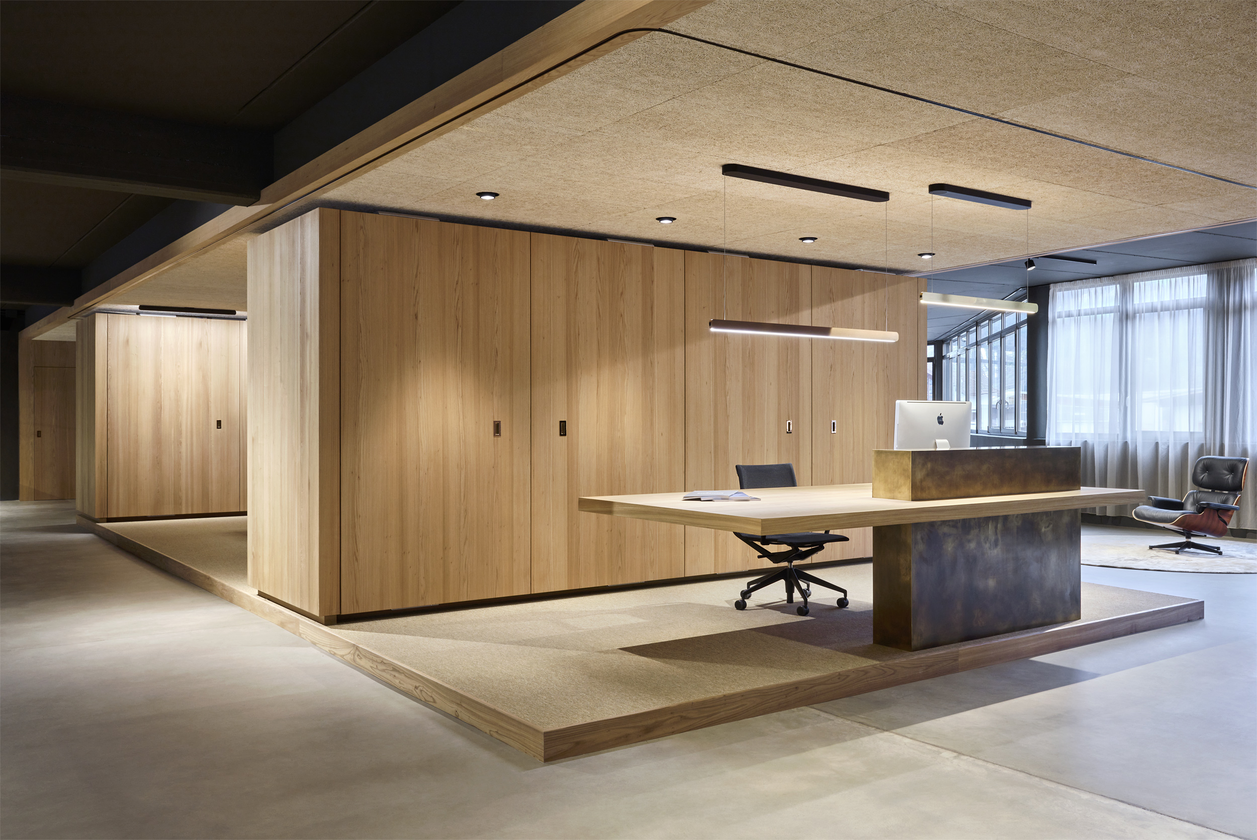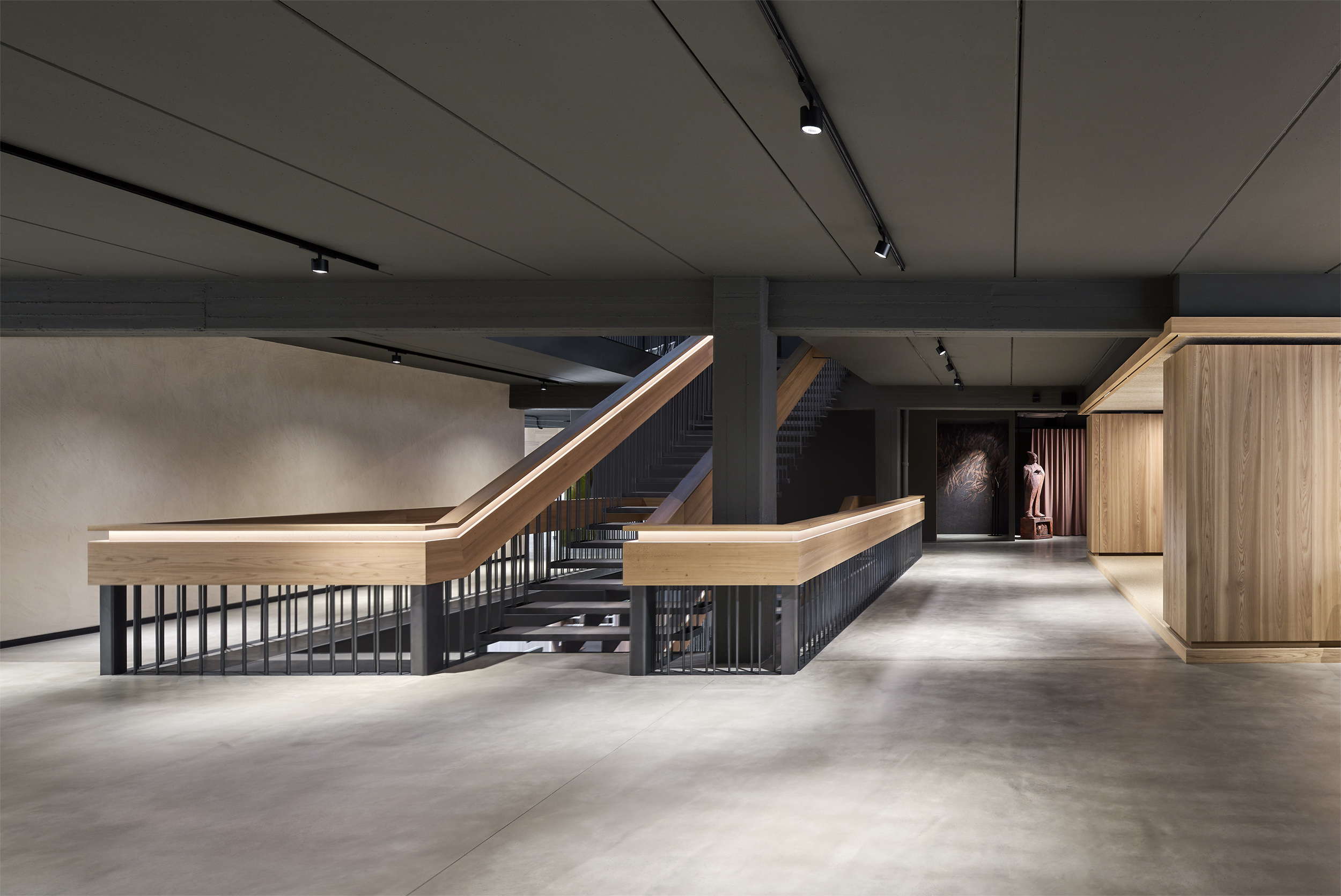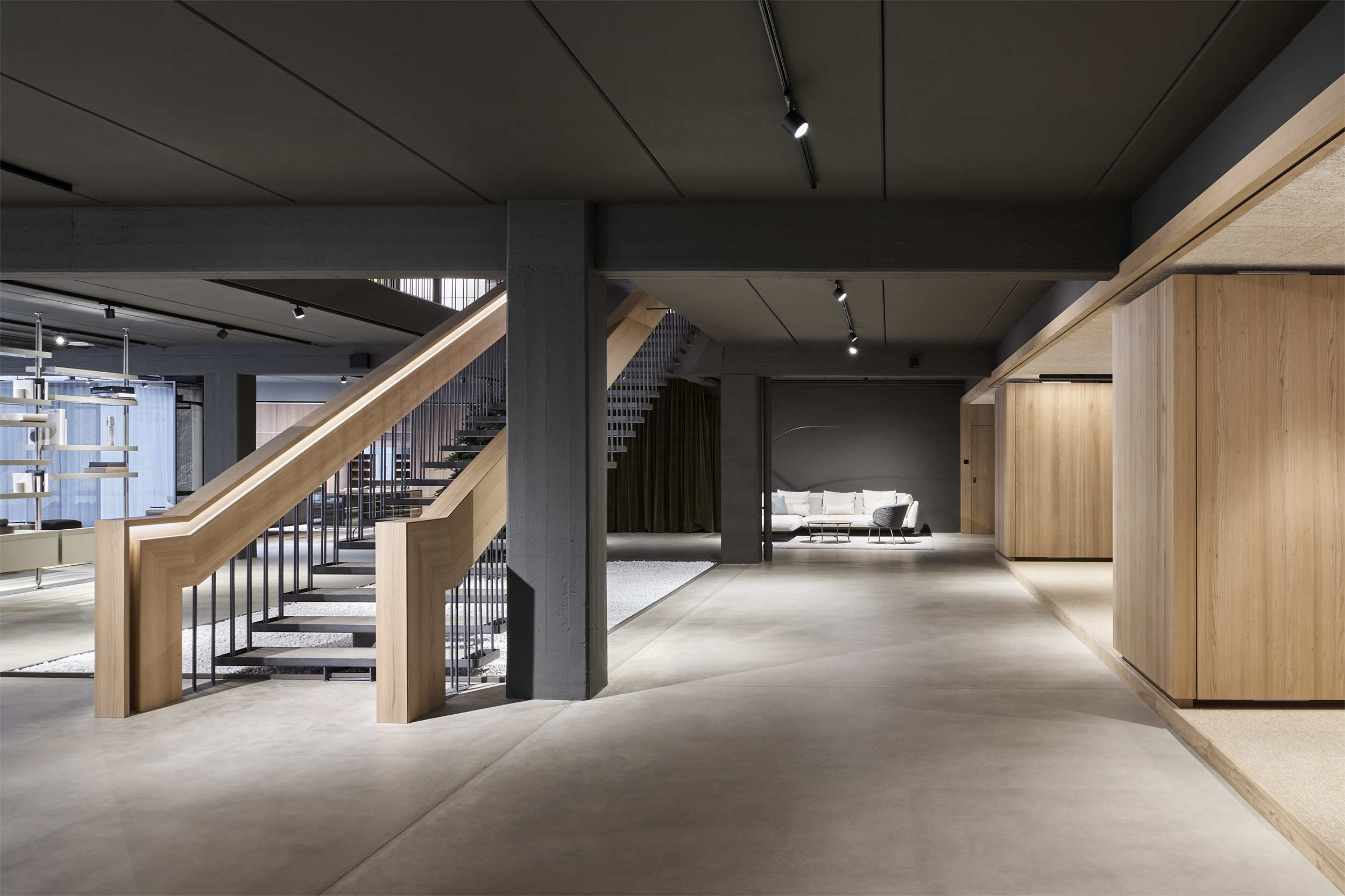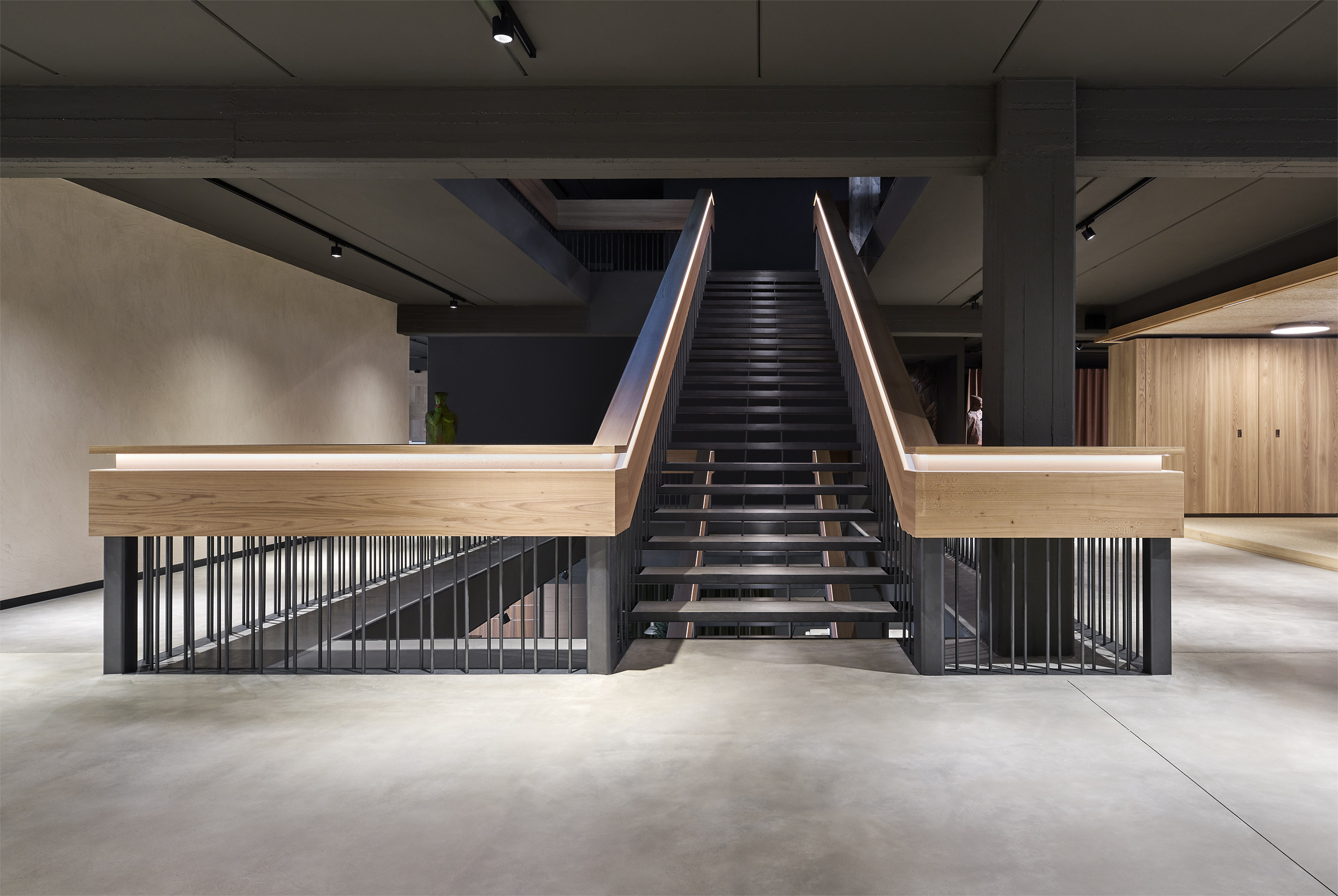 L'edificio è stato svuotato e i chiari pilastri e travi portanti sono stati resi visibili. Gli impianti esistenti sono stati lasciati a vista e l'intera struttura, sia internamente che esternamente, è stata dipinta con un unico tono scuro. Una nuova scala scultorea è stata installata centralmente, creando un collegamento ordinato tra i piani. Elementi in legno formano aree di lavoro nello spazio espositivo fluido - tende creano ambienti mobili e modificabili.