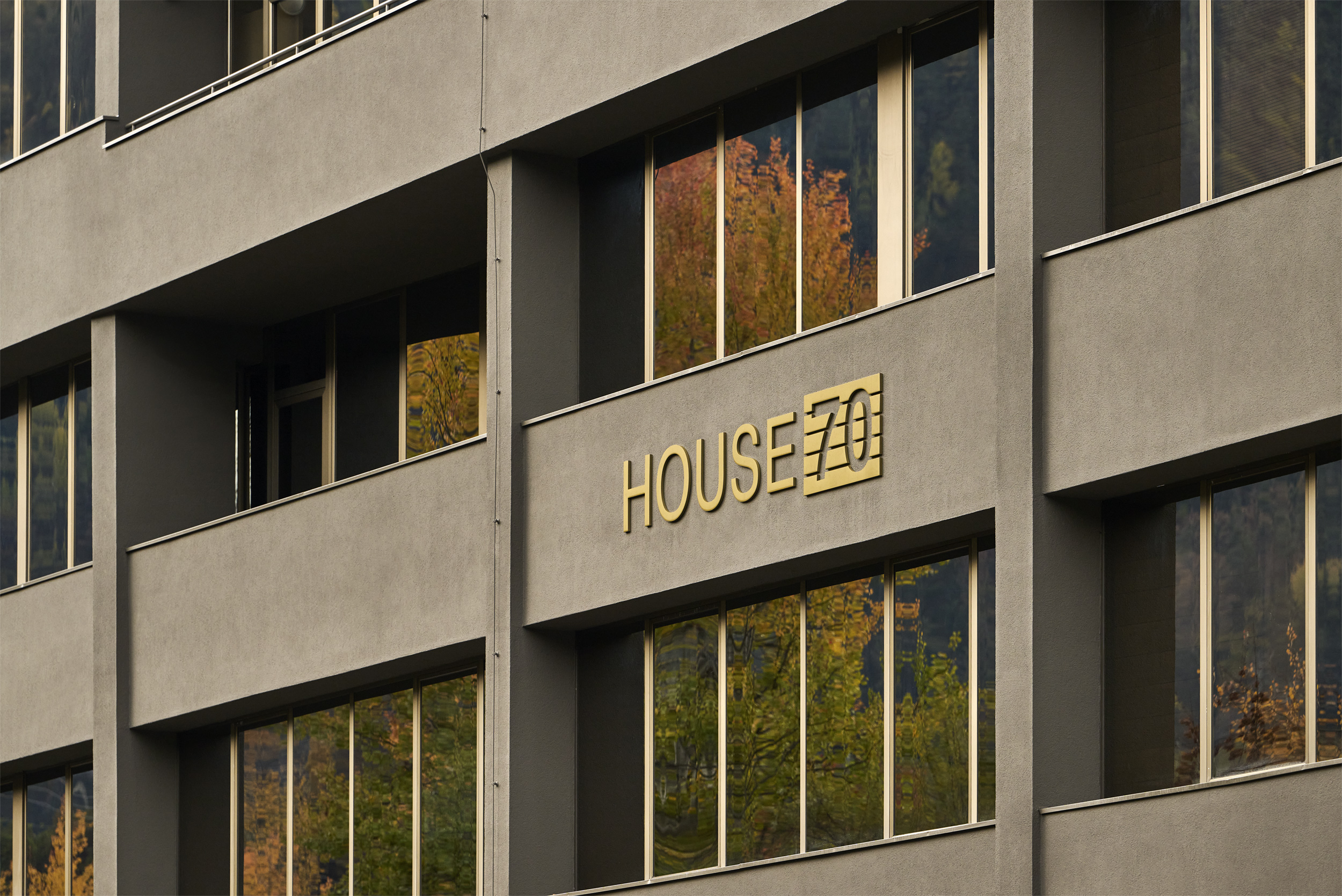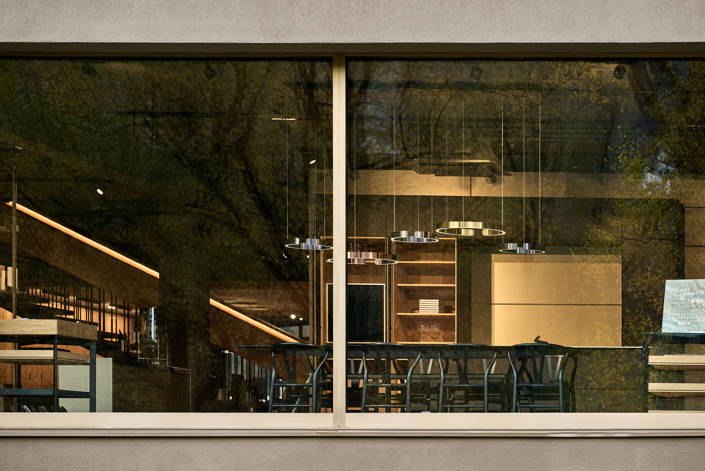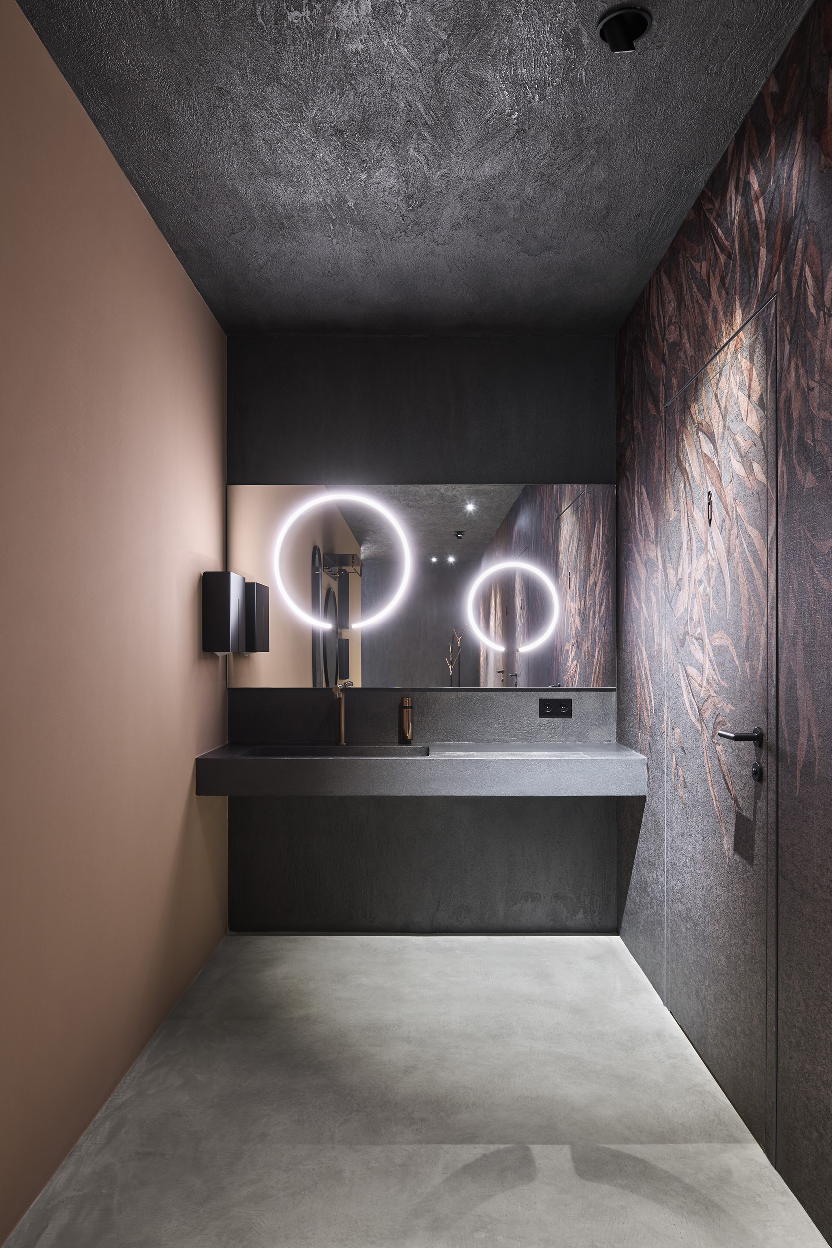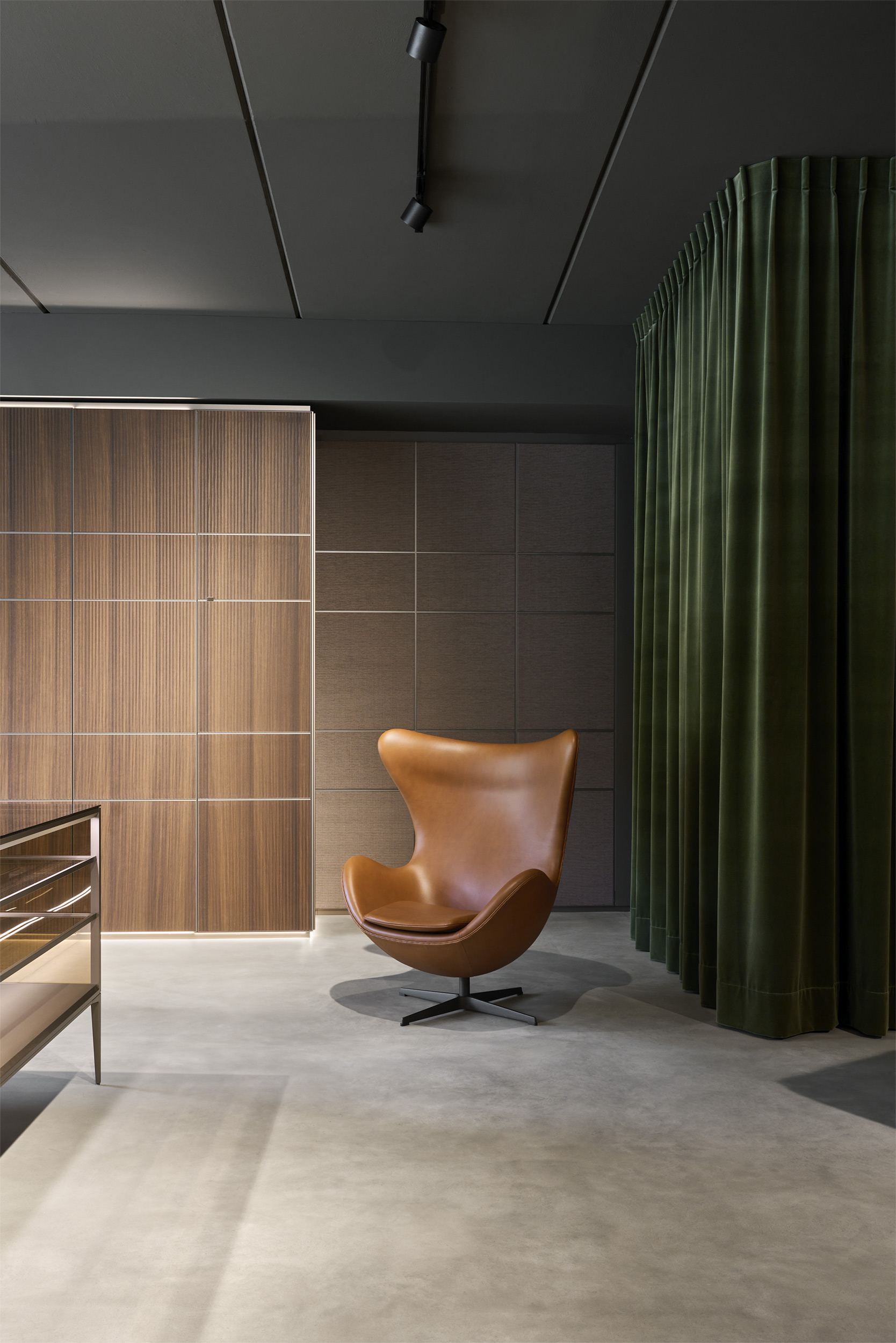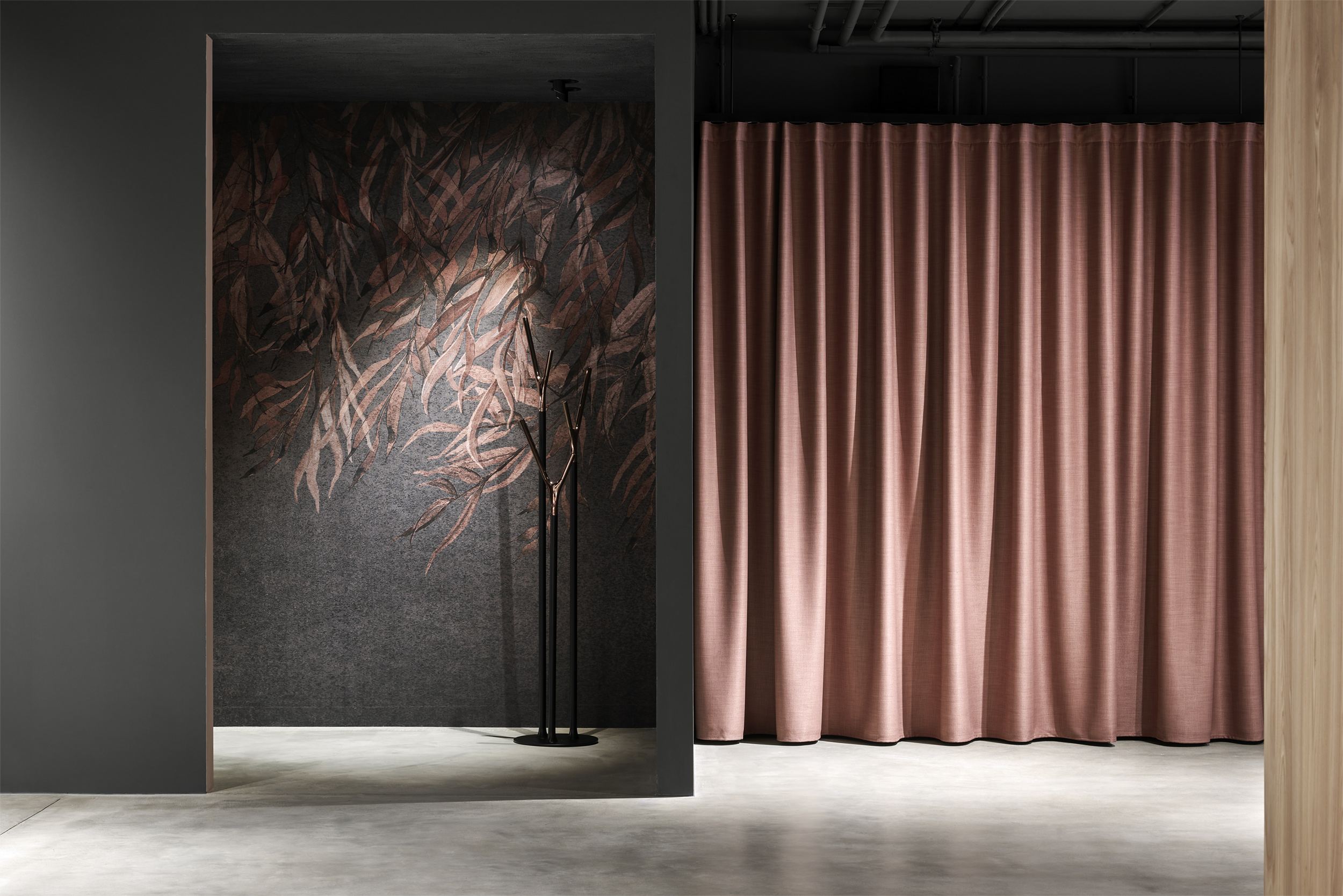 L'edificio è stato svuotato e i chiari pilastri e travi portanti sono stati resi visibili. Gli impianti esistenti sono stati lasciati a vista e l'intera struttura, sia internamente che esternamente, è stata dipinta con un unico tono scuro. Una nuova scala scultorea è stata installata centralmente, creando un collegamento ordinato tra i piani. Elementi in legno formano aree di lavoro nello spazio espositivo fluido - tende creano ambienti mobili e modificabili.