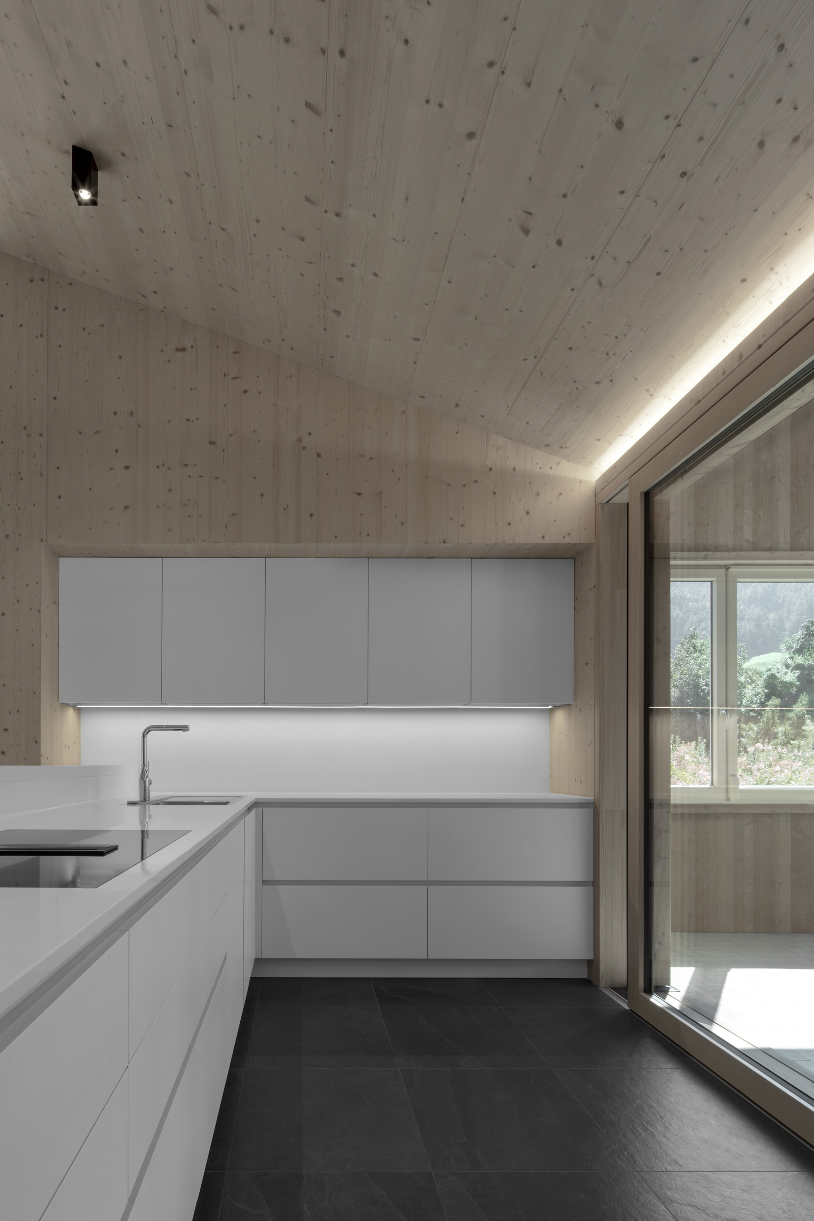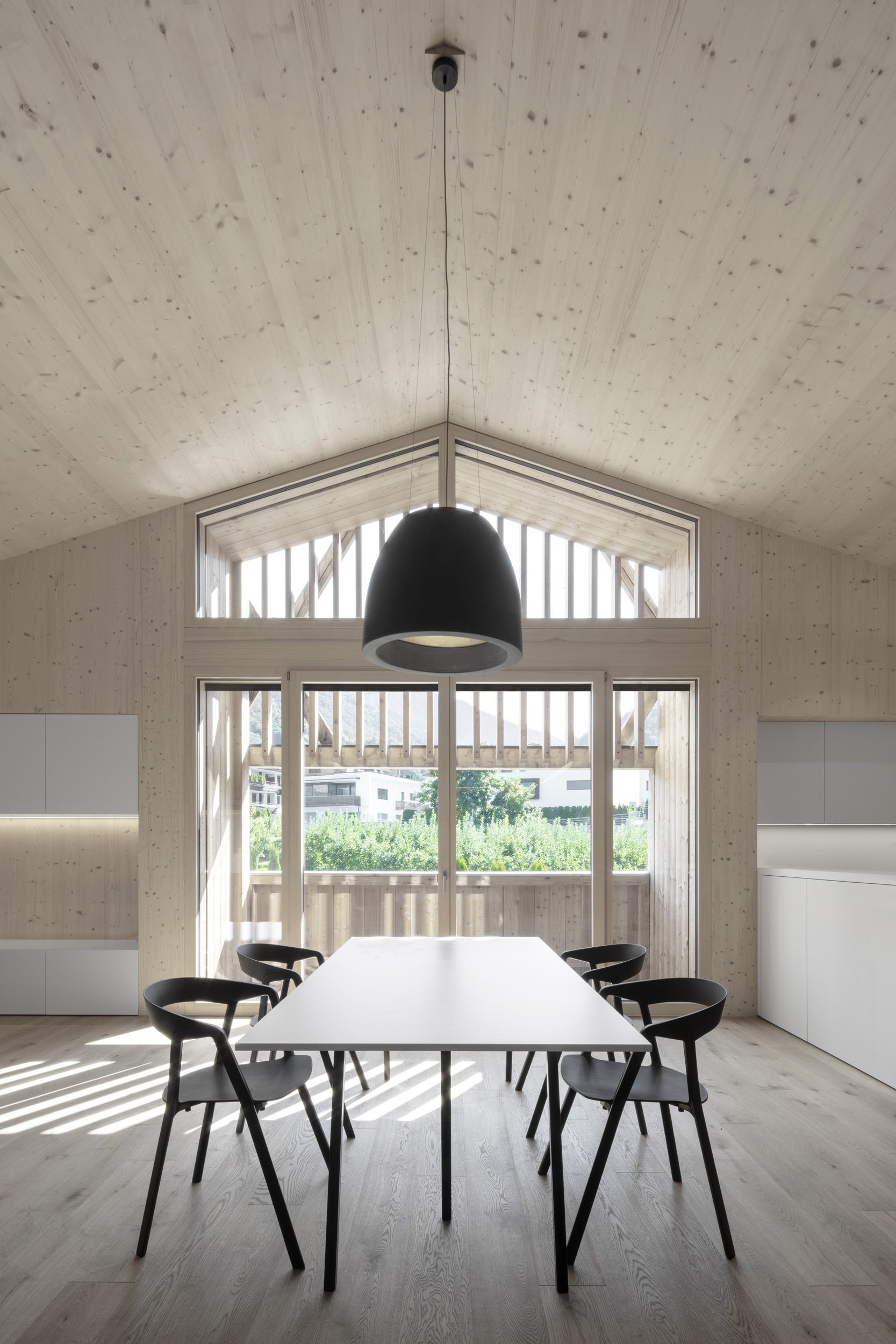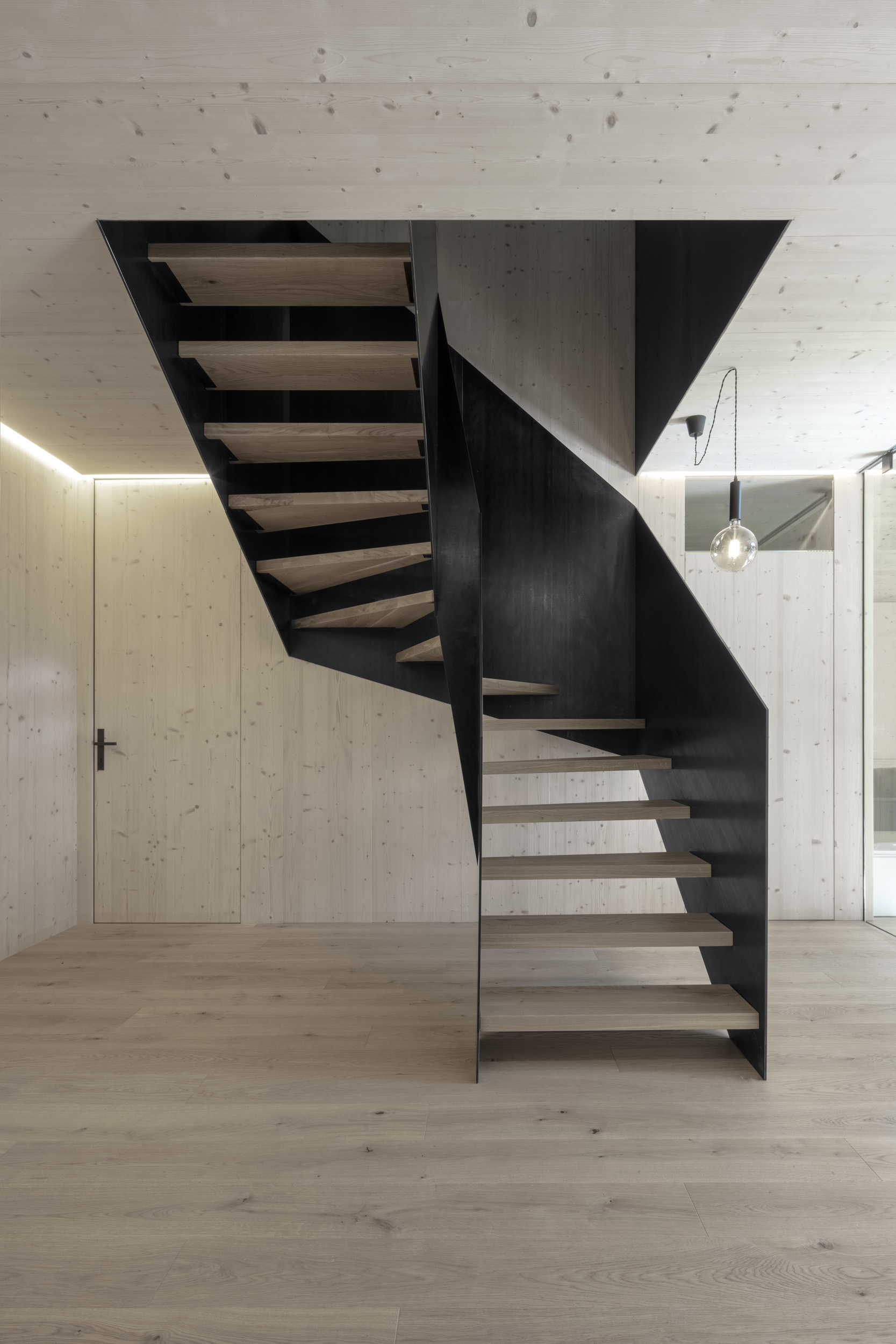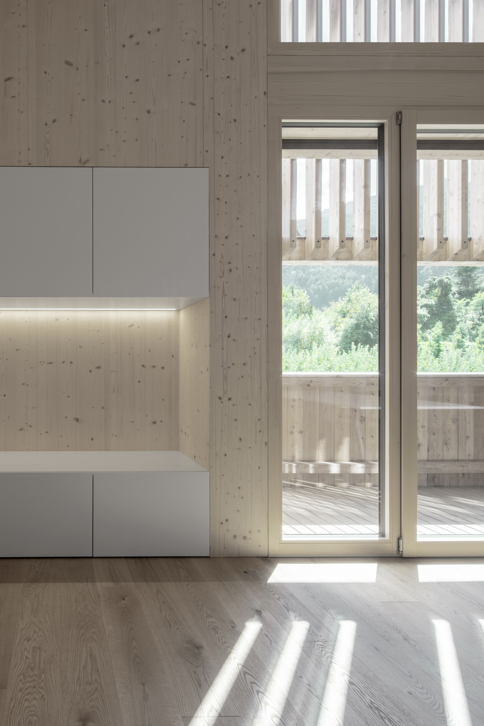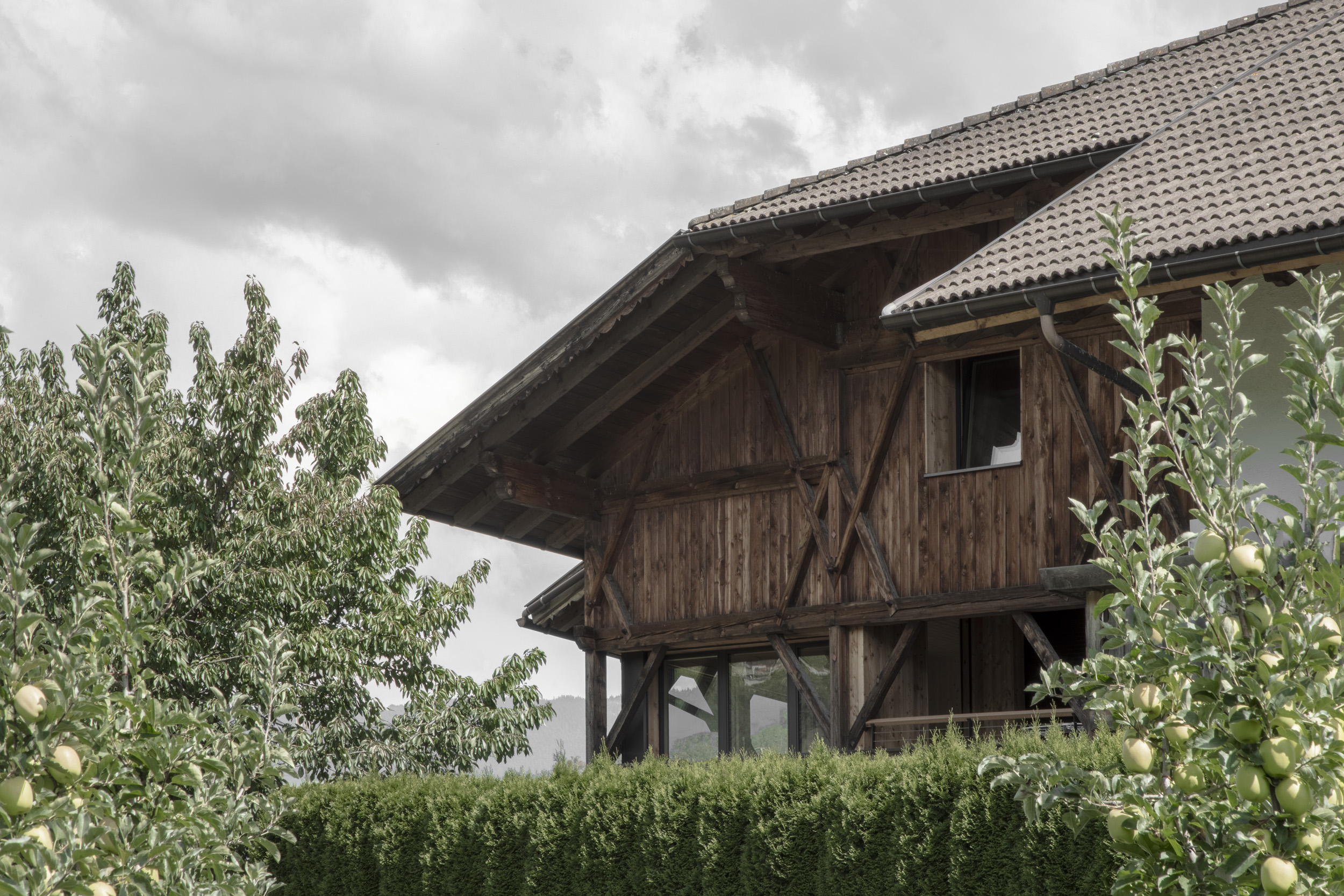 Viene realizzato un nuovo appartamento per il giovane agricoltore nel suo fienile attualmente vuoto. Il nuovo volume viene posizionato tenendo conto dell’esistente: la struttura portante rimane completamente invariata e le aperture esistenti vengono sfruttate per inserire le finestre. Le logge, abilmente scavate nel volume, consentono la realizzazione di vetrate generose e interni ben illuminati. Dall’esterno, il fienile rimane esteticamente quasi invariato. All’interno, le alte stanze riflettono l’originaria generosità degli spazi e l’uso del legno rimanda all’antica atmosfera del fienile.