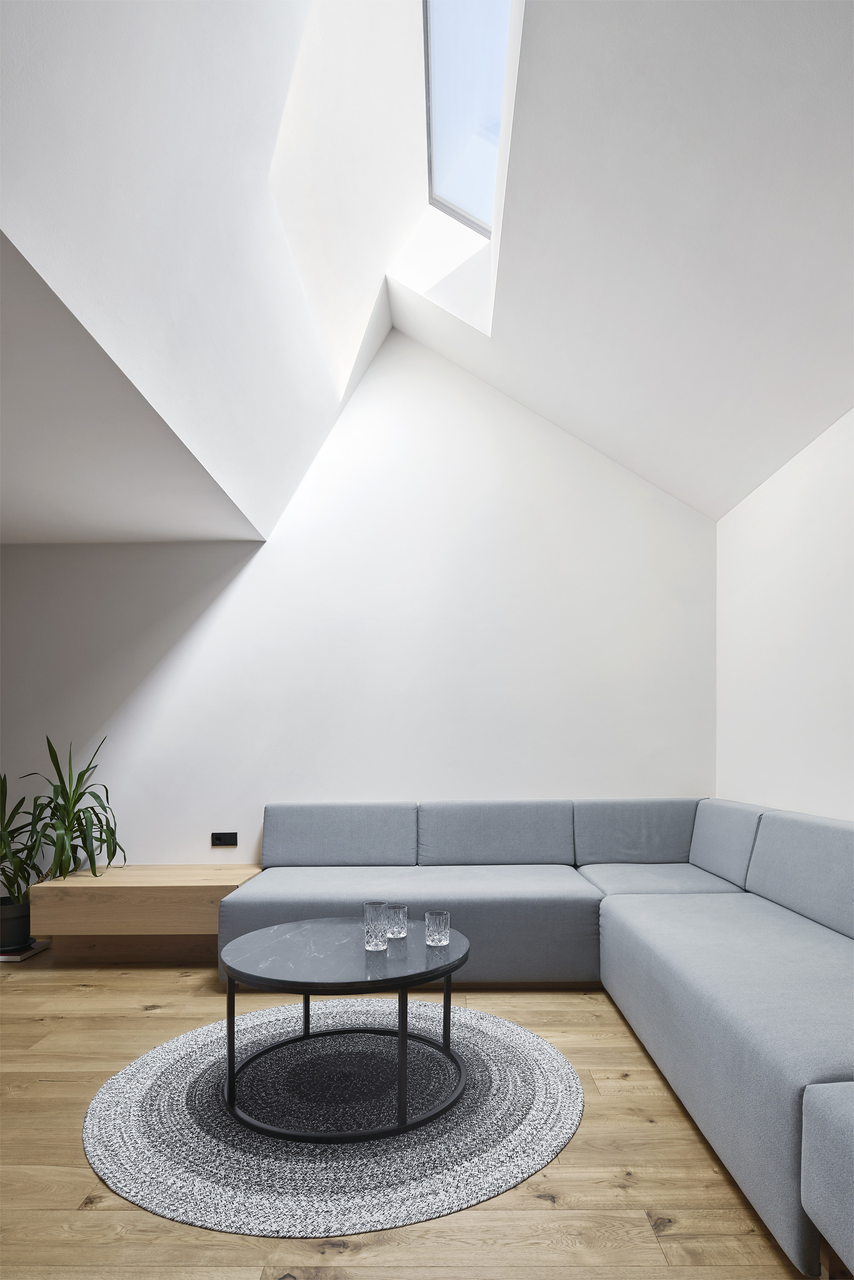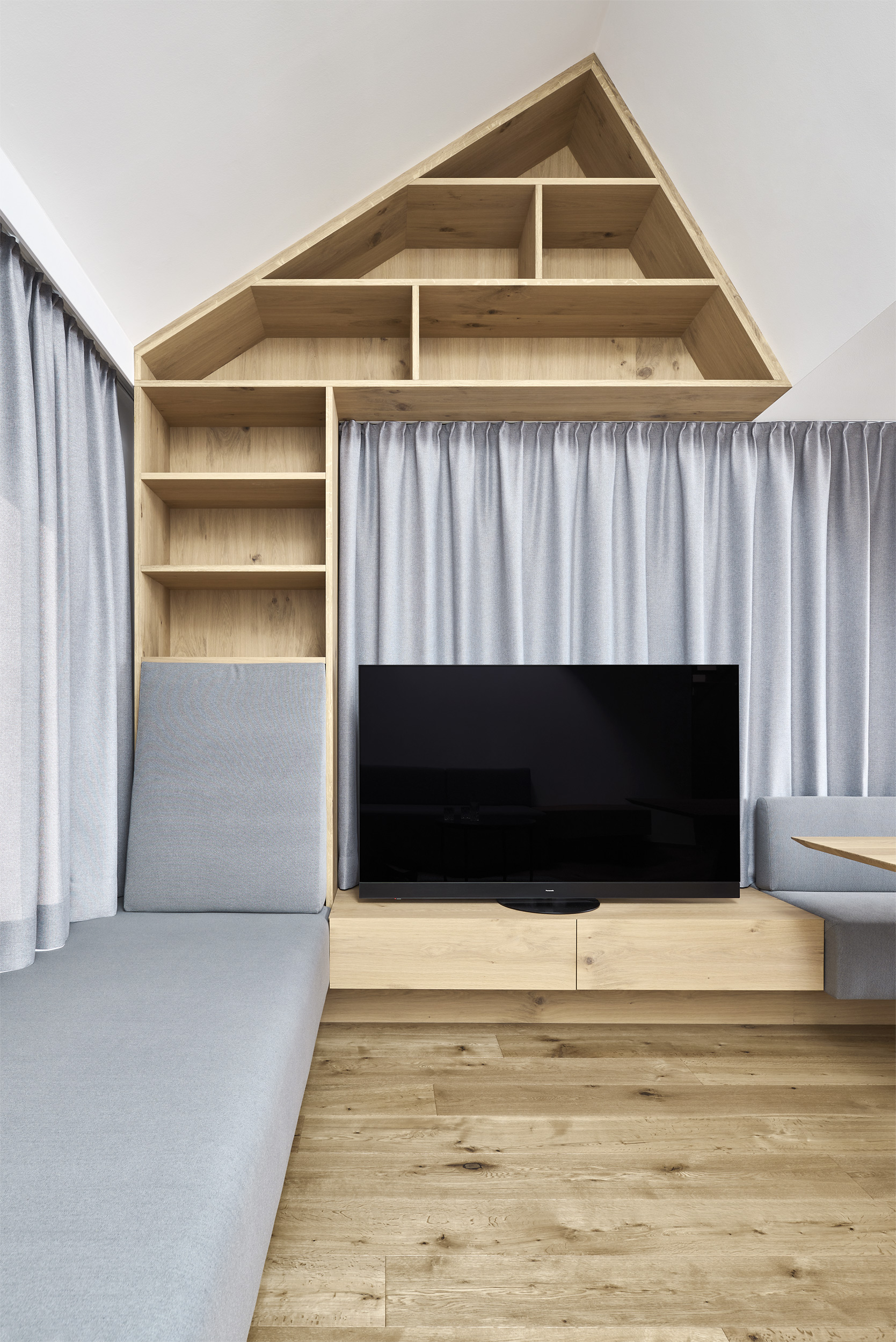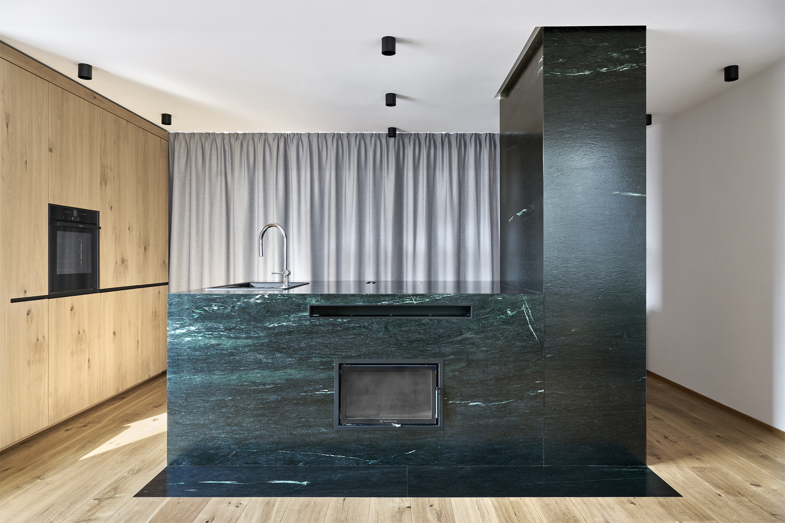 Il nuovo appartamento nel sottotetto della casa di famiglia sorprende con panoramiche vedute lontane. Il tetto stesso diventa un'esperienza, aprendosi intenzionalmente e creando spazi aperti sopra le teste dei vicini. All'interno, intonaco, rovere ed elementi tessili si armonizzano tra loro, creando un'atmosfera piacevole. L'ibrido di stufa e isola cucina si staglia con sicurezza nello spazio, realizzato in serpentino locale dal suggestivo tono verde smeraldo.